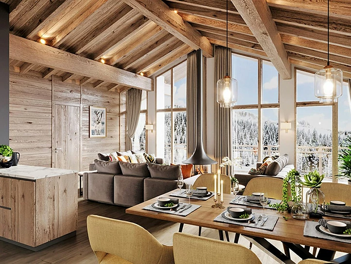 Découvrez un havre de paix en montagne dans nos nouveaux appartements, inspirés par le charme authentique d'un chalet de montagne intimiste. La façade traditionnelle en pierre et bois ainsi que le toit en pente créent une atmosphère chaleureuse et accueillante. À l'intérieur, le design contemporain s'allie harmonieusement au charme alpin avec ses boiseries, son parquet et ses cuisines équipées modernes. Les penthouses disposent de cheminées centrales, et certains appartements sont même dotés d'un espace bureau idéal pour le télétravail. Chaque bien possède un balcon offrant une vue exceptionnelle sur le village et les sommets environnants.