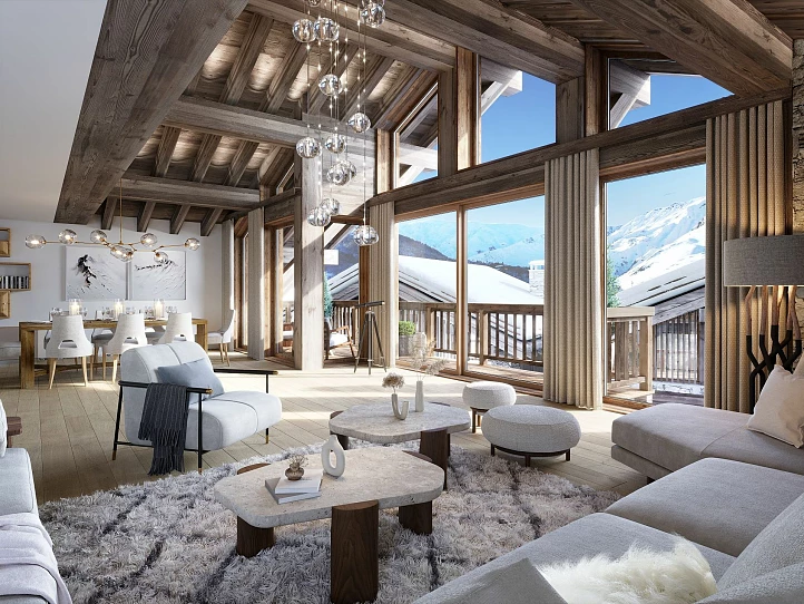 Ce nouveau programme immobilier se compose de trois chalets individuels, deux demi-chalets et quatre appartements en duplex ou triplex. S'intégrant parfaitement dans l'architecture locale, les propriétés seront construites dans un style traditionnel avec des toitures en ardoise à forte pente et des façades en pierre locale et bois vieilli. Les intérieurs allient style alpin contemporain et authenticité, avec de magnifiques boiseries anciennes aux murs et des finitions haut de gamme. Chaque résidence dispose d'un espace de vie ouvert avec salon et salle à manger, de deux à quatre places de stationnement, d'un espace extérieur et de cheminées. Les chalets sont également équipés de saunas, et certaines propriétés bénéficient d'ascenseurs pour un accès facilité.