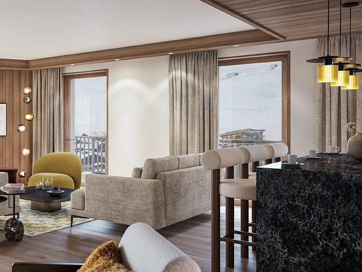 The development comprises 19 apartments sized between 46 and 101 sqm, each of which is finished to a high standard by a respected developer. Residents enjoy direct slope access, private ski lockers, and underground parking. Amenities include a 1,900-sqm wellness area with a pool, sauna, hammam, snow room, and gym. On-site dining includes a Savoyard and an Italian restaurant, plus a panoramic rooftop bar. A kid’s club and ski shop add convenience and family appeal.