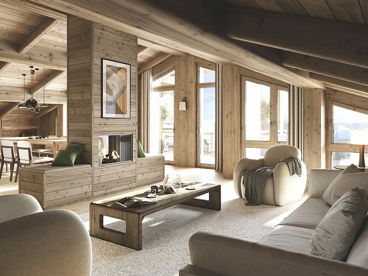 L'Ecrin is a stunning collection of 23 spacious apartments, paying homage to local architecture with traditional materials such as local stone, larch wood cladding, and slate roofing. Each apartment features large windows and exterior space with breathtaking views of Solaise, Fornet, and Col de l'Iseran. The interior design offers a choice between traditional Alpine or contemporary styles, and all residences are sold fully furnished and equipped. Perfect for families, nearly all apartments include a bunk bedroom. L'Ecrin also boasts elegant communal areas, including an igloo-inspired reception and a wellness area with a spa, gym, and swimming pool. Ski lockers, cellars, and parking are included.