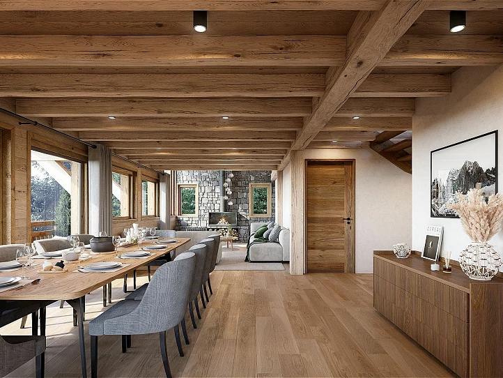 This chalet invites you to a warm and comfortable sanctuary. The property has an interior area of 290 sqm (400 sqm in total) and hosts four comfortable ensuite bedrooms. Unwind in the wellness area, enjoy a quiet workout in the gym, or share moments in the wine cellar with its own bar. Relish cinematic evenings in the home cinema. The chalet boasts a spacious open-plan living area with a cathedral ceiling, leading gracefully to a 34 sqm south-west-facing terrace - an ideal space for cherished gatherings. The property also features a garage.