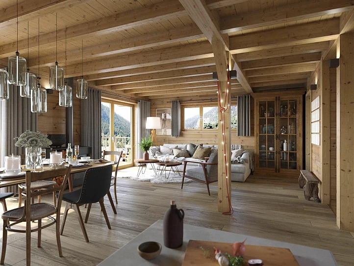 Nestled in the heart of the mountains, these stunning apartments perfectly blend with the local architecture. With multiple sloping roofs, natural stone cladding on the ground floor, and wooden balconies, these one to five-bedroom apartments are ideal for families. The interior areas range from 32 to 159 sqm, with some featuring a bunk bedroom for flexible sleeping arrangements.