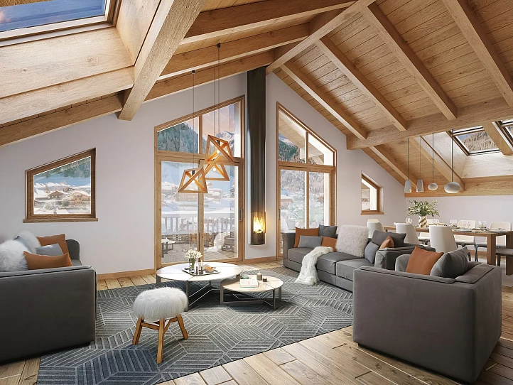 The development features two exceptional penthouses and one spacious 5-bedroom apartment. Each penthouse offers expansive living areas, with 3 bedrooms, a bunk-room, and a large mezzanine that can be used as an office, kid’s space, or extra bedroom. The 5-bedroom apartment benefits from triple exposure and has balconies on all sides. Chalet-style architecture, with XL balconies and woodcarved balustrades, enhances the charm, while the high-end finishes reflect the craftsmanship of Morzine’s largest developer.