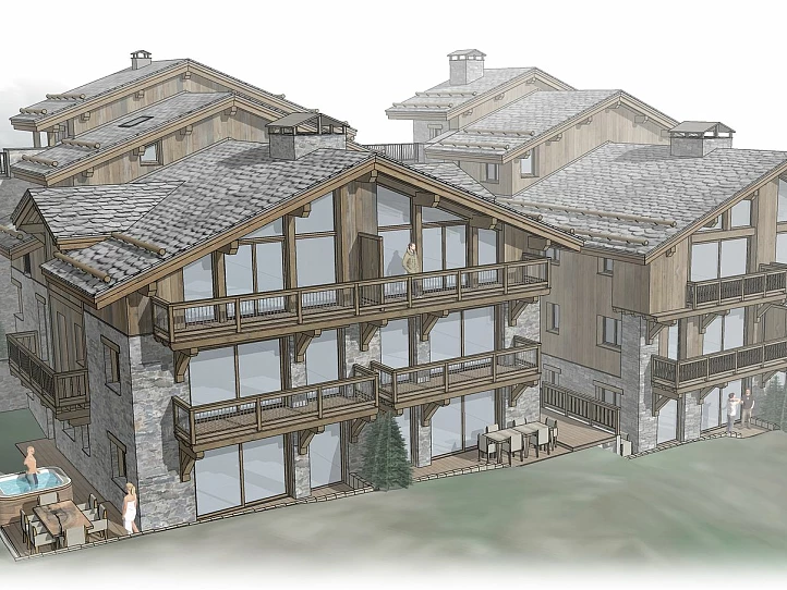 The project comprises two large chalets divided into 12 apartments ranging from 95 to 130 sqm, each with 3–4 bedrooms. All residences benefit from outdoor space and open west-facing views, with optional jacuzzis for ground-floor units. High-quality finishes are delivered by a respected local developer. Each apartment includes a ski locker, cellar and outdoor parking space, with the flexibility to merge units into larger apartments or create an individual chalet.