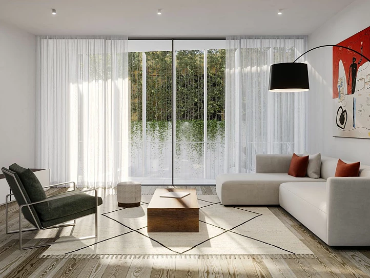 Spanning 83 sqm of interior space with an 8 sqm private balcony, this apartment features engineered oak wood flooring, high ceilings, and expansive windows that fill the space with natural light. The kitchen is equipped with Miele appliances and Corian countertops, while the bathroom is finished in smooth stone with brushed steel fixtures. Class A energy certification and individually controlled climate systems ensure efficient year-round comfort.