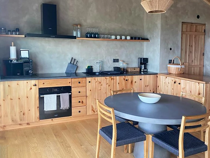 Denna eleganta bostad om 197 kvm fördelar sig över två plan och erbjuder två sovrum. På bottenvåningen finns sovrummen och ett praktiskt arbetsrum, medan övervåningen bjuder på ett socialt utrymme med öppen planlösning som leder ut till en härlig terrass. Bostaden utmärker sig genom sina exklusiva materialval, där vulkanisk sten möter lokalt producerad cryptomeria japonica-trä, vilket skapar en unik karaktär. Tillgång till gemensam pool samt en betagande panoramautsikt över den grönskande skogen och Atlanten gör detta till ett helt särskilt boende.